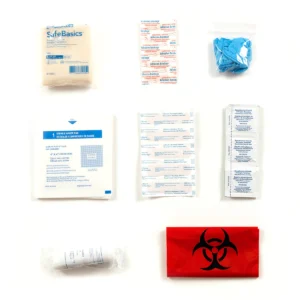 1 – biohazard bag 2 – pairs of clear safety glasses 6 – medical masks -