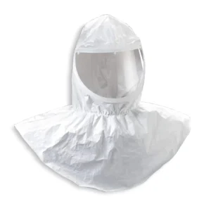 - Attached respirator-fit hood with elastic around face opening, designed to cover neck and chin and fit around respirator face mask